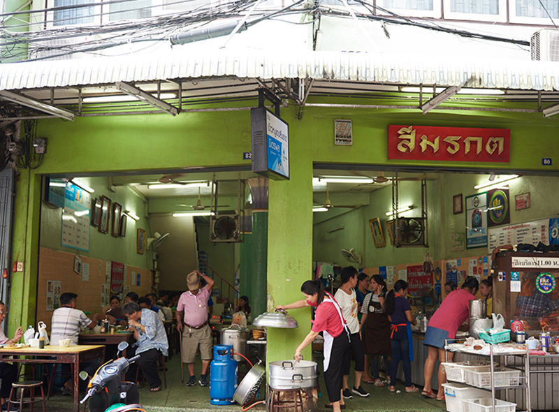 松记猪肉串烧。在金佛寺走向 Su-korn巷 (又称猪寮巷),就见到很多好吃的美食店及摊位,松记的猪肉及猪肝串烧很有名,尤其猪肝切得很薄,烧烤到恰恰好,再过去一点,有一家叫翡翠叉烧饭,及香脆烤肉,已卖了几70年,可所此地最好吃的美食,还有猪肉冬央粿条,冰淇淋店,及粥店等等。